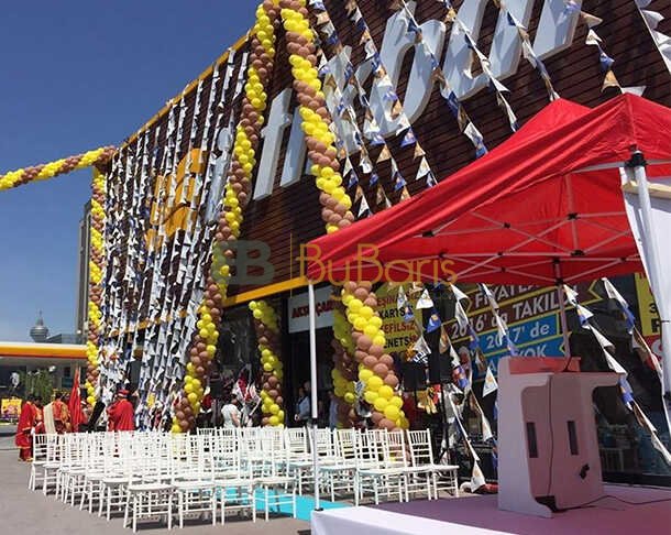 Açılış Organizasyonlarının olmazsa olmazı çevre ve mekan süslemeleridir. Bu süslemeleri destekleyen ses sistemi ve palyaçolar da diğer önemli araçlardır diyebiliriz.