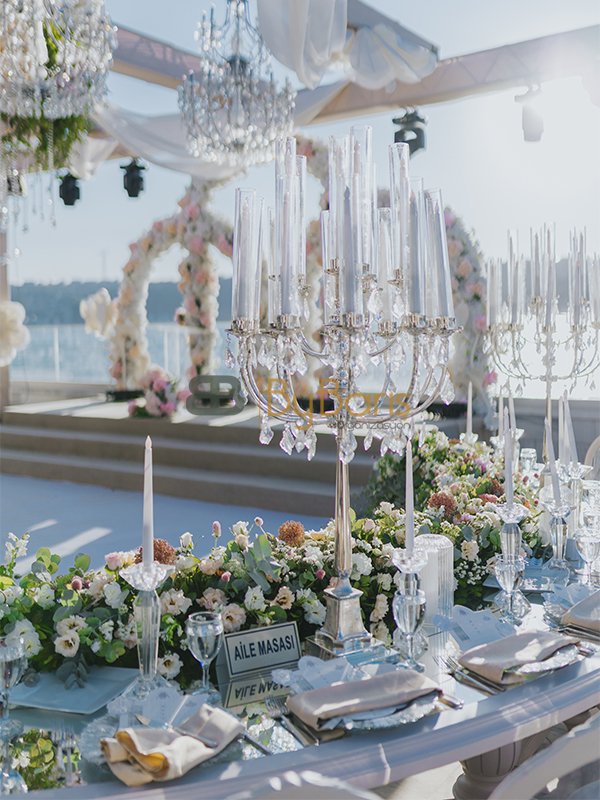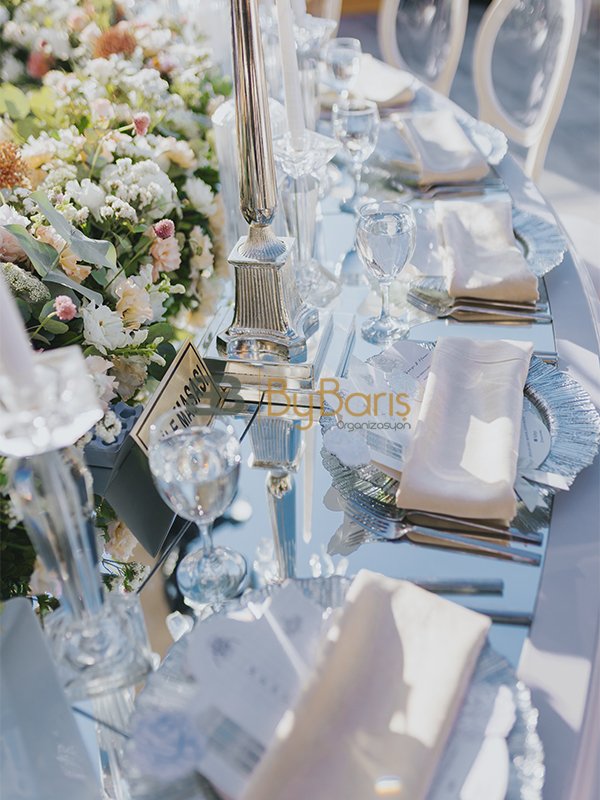 Çiftimizin seçtiği tema doğrultusunda hazırlanan masa üstü süslemeler, romantik ve sofistike bir atmosfer oluşturdu. Her detay, fotoğraf karelerinde bile öne çıkacak şekilde tasarlandı.