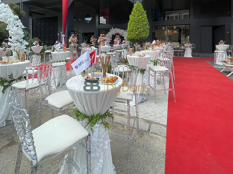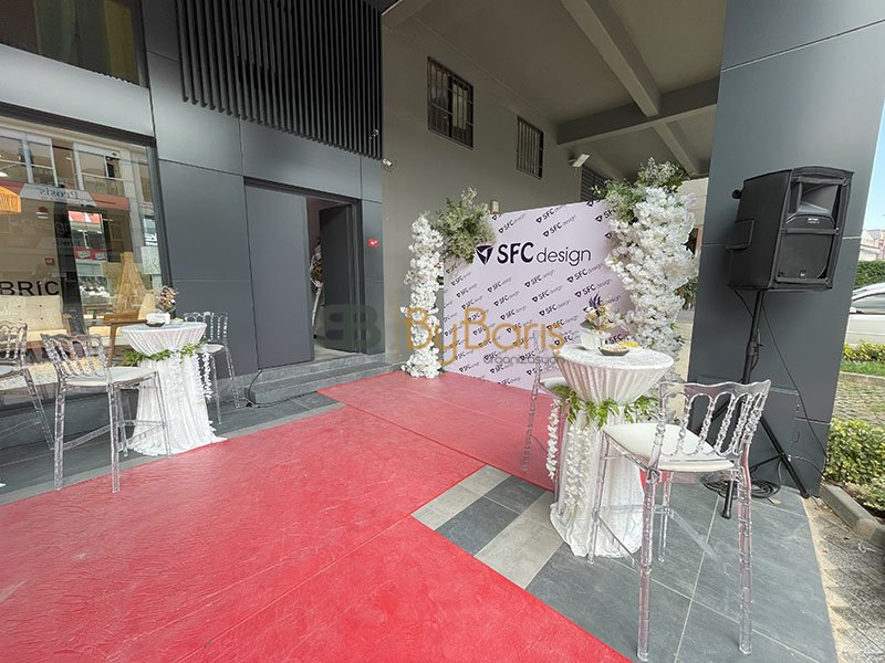 Dekorasyon ve Temalı Tasarım: SFC Design’ın tasarımlarına uygun olarak özel bir dekorasyon konsepti oluşturduk. Mekânın her köşesi, markanın estetik anlayışına uygun zarif detaylarla donatıldı. Bu sayede, katılımcılar açılış alanına adım attıklarında markanın modern ve şık tasarım anlayışını hemen hissettiler.