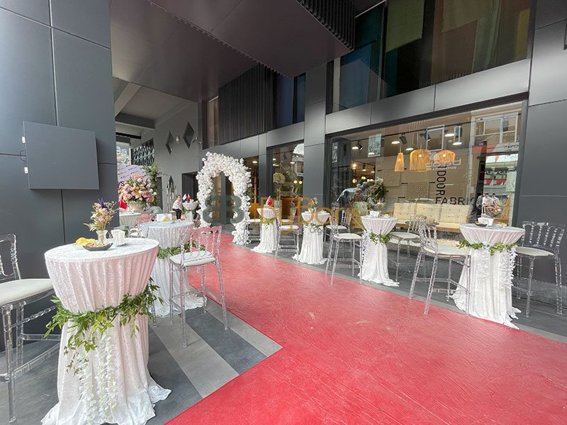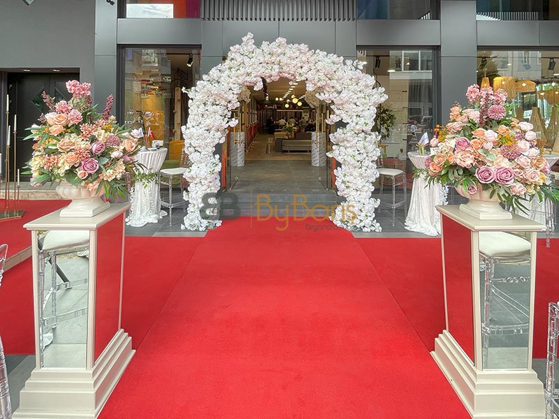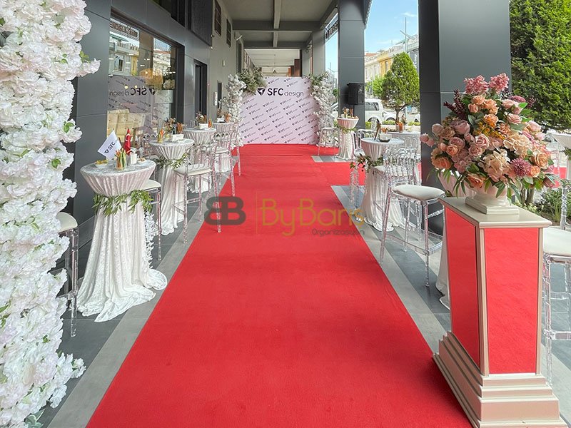 Kırmızı Halı Serimi: Açılışın prestijini artırmak için konukları kırmızı halı üzerinde karşıladık. Kırmızı halı, etkinlik alanına şıklık ve ihtişam katarken, konukların kendilerini özel hissetmelerini sağladı.